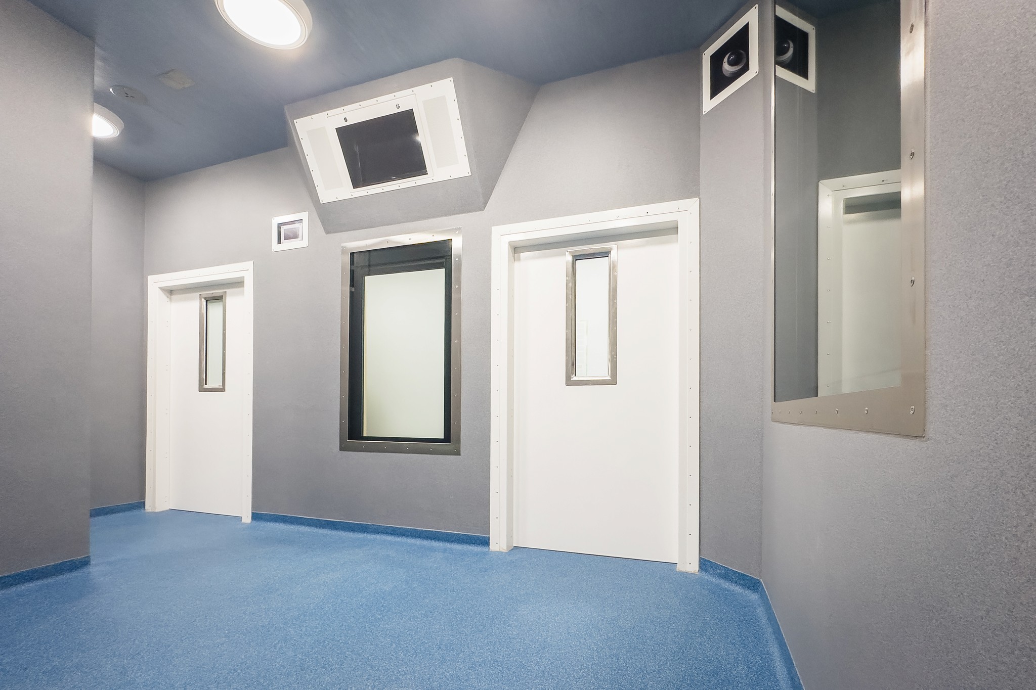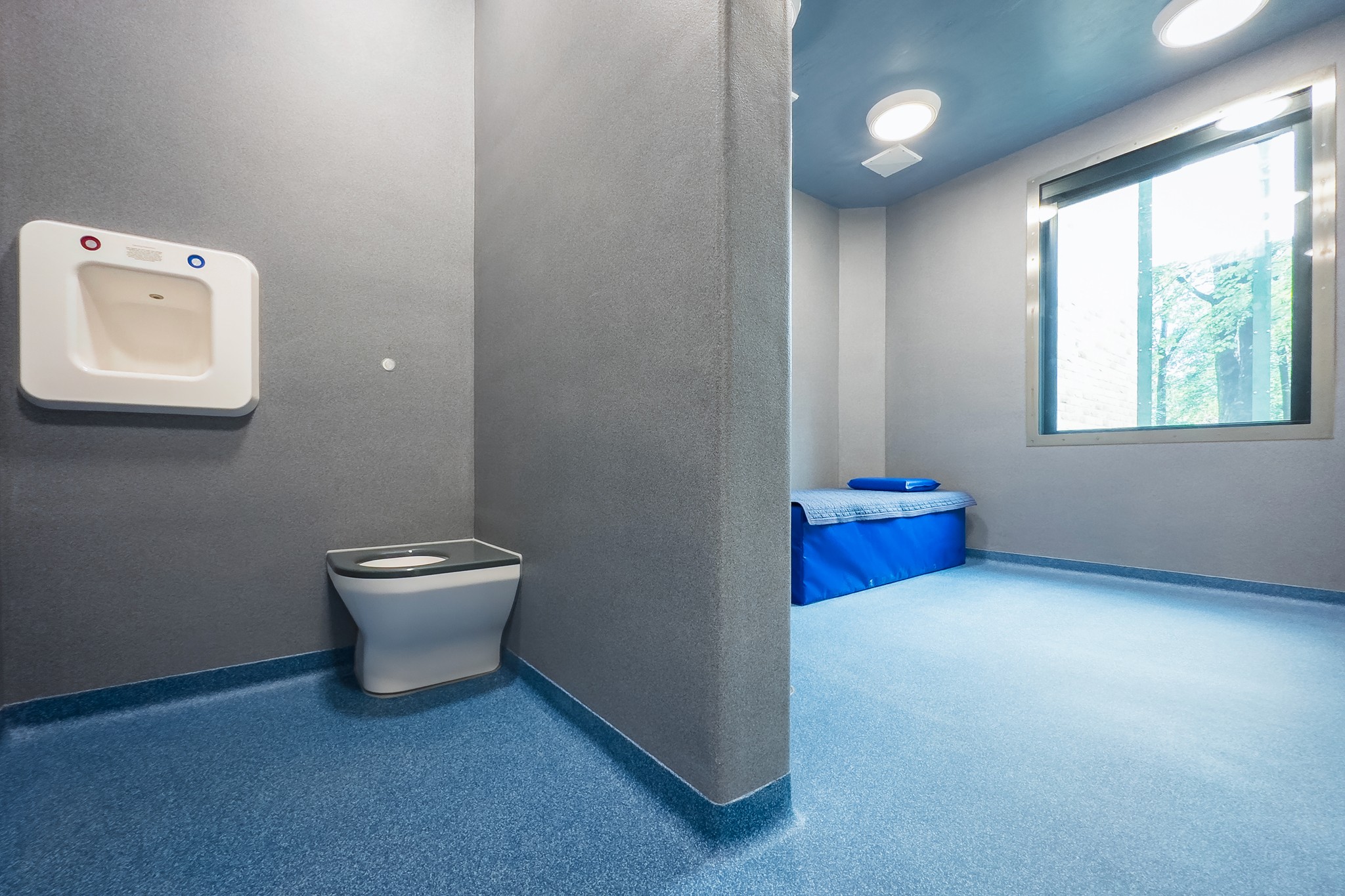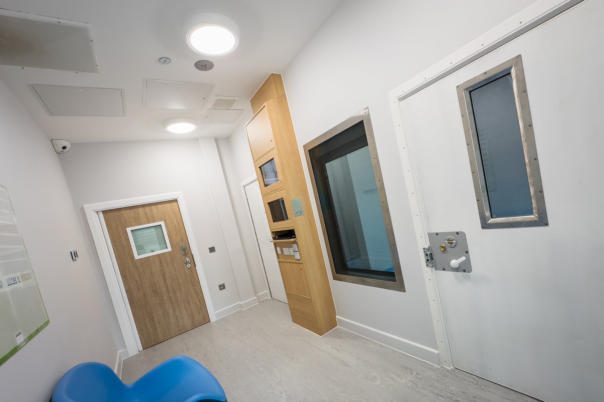 The core scope comprised the construction of two adjoining seclusion suites, each incorporating an integrated viewing area to support discreet observation. Large-format vision panels were installed with remote-controlled blinds contained between the glass, allowing staff to manage privacy without compromising safety or supervision. The layout was developed to support clear sightlines, controlled access, and robust performance within a high-dependency environment.